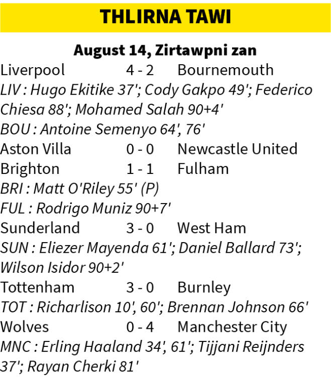 Premier League ṭan a ni leh a, champion lai Liverpool-in Anfield-ah champion zia chhuahin Bournemouth 4-2 in an hneh. Mahse, Arne Slot-a hote an famkim bik lo a, an tlarhnung a pawp avangin point hloh thei dinhmunah ding. Minute hnih chiah a awm tawh tihin Federico Chiesa-a'n hmahruaina goal a khung a, Mohamed Salah-a'n injury time-ah chak nemnghetna goal a khung.