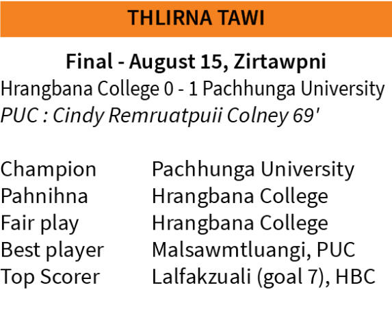 I Day Hmeichhe Football inelnaah Pachhunga University College-in nomawi chawi turin final-ah Govt Hrangbana College 1-0 in an hneh a, goal awmchhun hi Cindy Remruatpuii Colney khung a ni. PUC hi MPL-a player langsar ni ṭhin Lalrinchhana (RCh-a) leh hmeichhe football-a tawnhriat nei ṭha Grace Lalrampari ten an enkawl a, final-ah team ṭha zawka ngaih HBC an hneh.