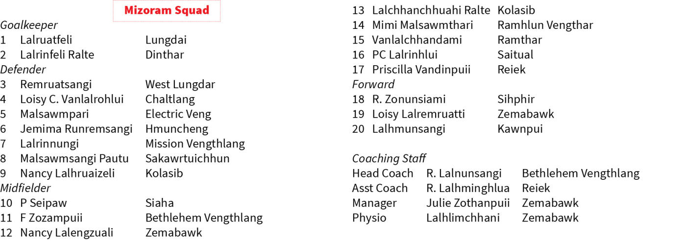 Mizoram hi head coach R. Lalnunsangi'n (Manuni) a ho a, Pathianni khan Jorhat panin August 20, Nilaini hian match hmasa berah Meghalaya an hmachhawn ang. Group khat aṭangin team pakhat chauhin semifinal an luh dawn avangin match tin hi a pawimawh vek dawn.