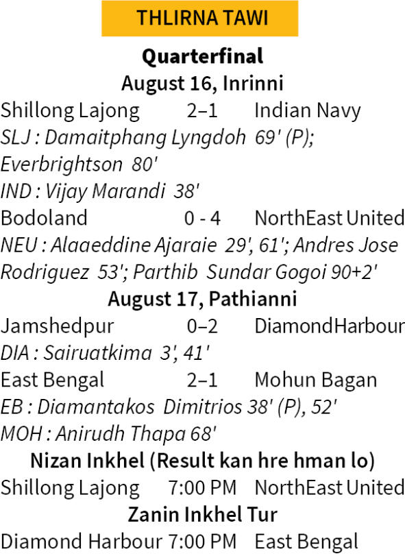 Durand Cup semifinal-ah zanin dar 7:00 hian I League kai thar Diamond Harbour-in ISL club East Bengal te Salt Lake Stadium-ah an inkhel dawn a, team pahnihah hian Mizo player-te an pawimawh ve ve.