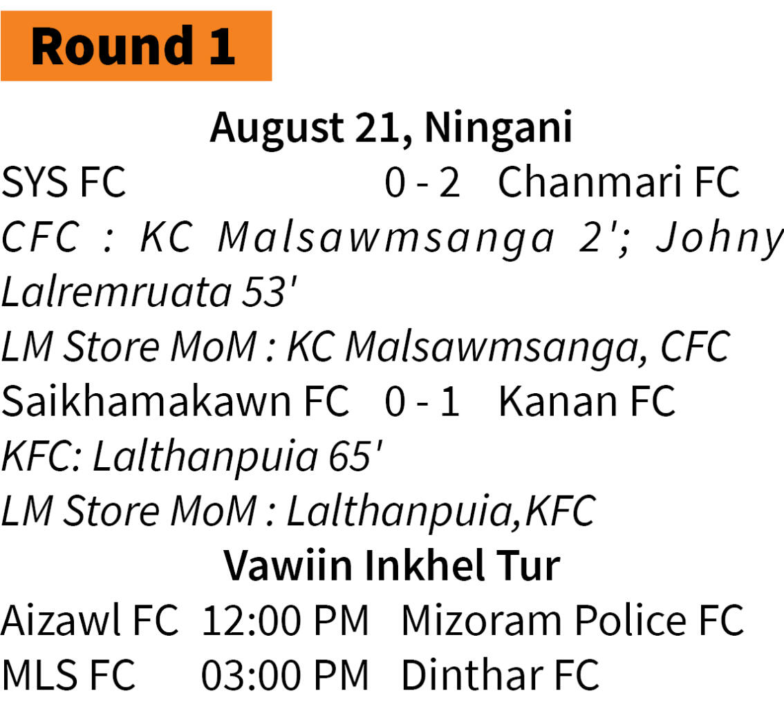 Kanan FC chuan GIG Motors MPL12 an match hmasa berah anmahni ang bawka kai thar Saikhamakawn chu 1-0 in an hneh a, goal awmchhun hi Lalthanpuia (Tepuia) khung a ni. Chawngthansanga hote an khel ṭha a, I Day Football semifinal-a an hneh loh Lalsangzuala Hmar hote lakah phuba an la.
