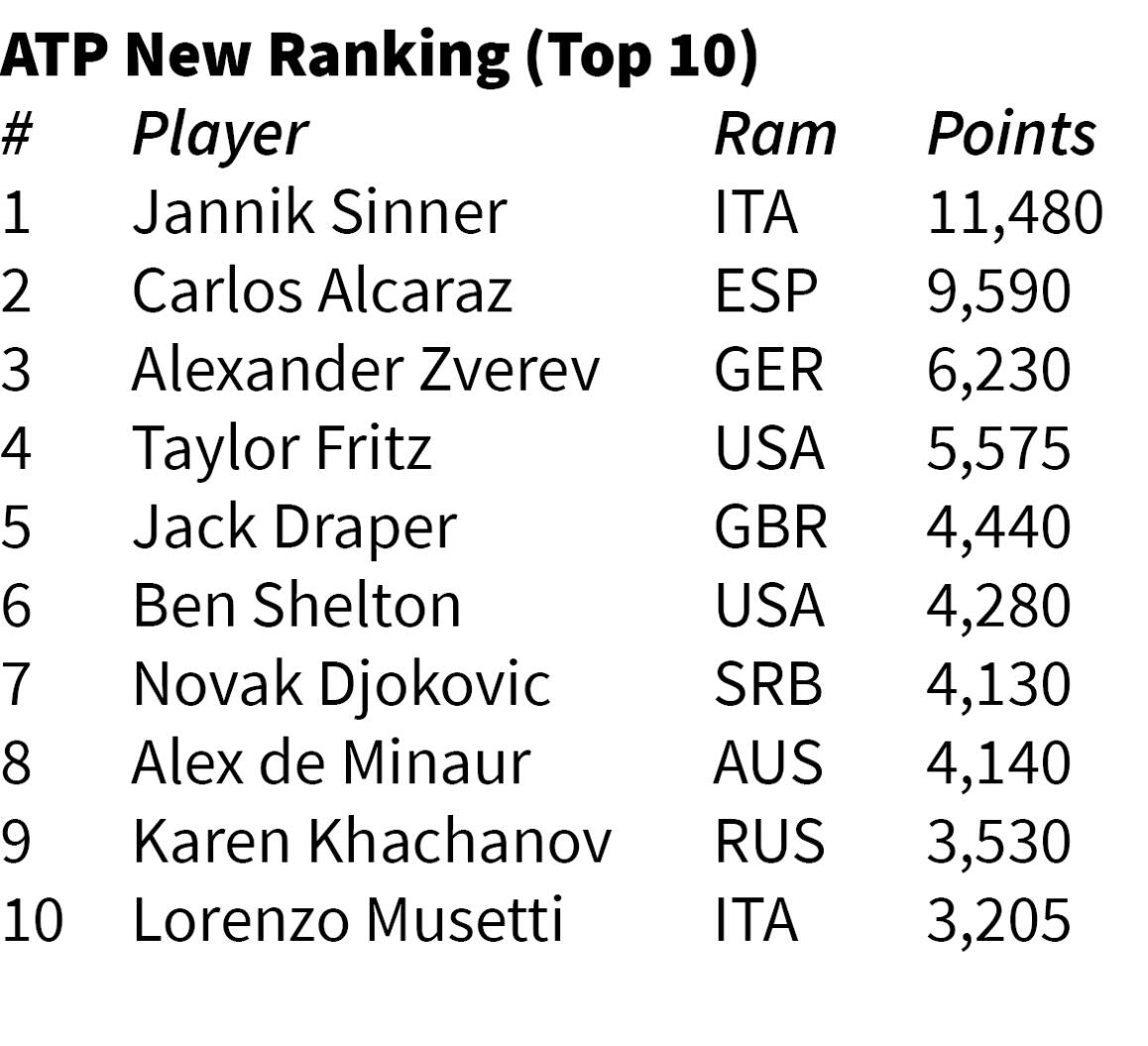 US Open champion Sinner aia Alcaraz hniam zawkna hi point 1890 chauh a ni a, season hmasa khan Spanish star hi second round-ah a tla, point humhim tur 50 chauh a nei tihna a ni a, kuminah a khel ṭha a nih chuan number 1 nih theihna remchang a nei ang.