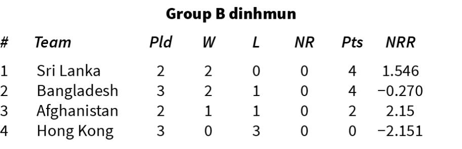Zanin dar 8:00 hian Sri Lanka leh Afghanistan an inkhel dawn a, Lions hi an chak a nih chuan Bangladesh hian Super Four an lut thei ang. Group B-ah Sri Lanka (NRR +1.546) leh Bangladesh (-0.270) ten point li ve ve an hmu tawh a, Afghanistan-in (+2.150) point hnih chauh an hmu. Chutihrualin Afghanistan hi an NRR a ṭha a, Sri Lanka an hneh hrim hrim chuan Super Four an lut ang.