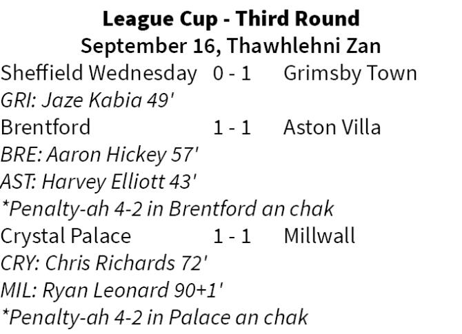 Manchester United tel ve tawh lohna League Cup third round chu Thawhlehni zan khan khelh ṭan a ni a, Champions League khel ve lo EPL club inlanah Crystal Palace an chak a, Brentford-in Villa an pet chhuak thung.