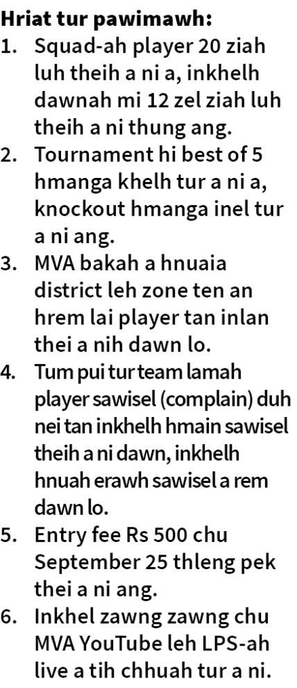 Mizoram Volleyball Association (MVA) buatsaih - VC/LC Volleyball Tournament 2025 khelh hun a hnai a, tel tum tan September 25, Ningani thleng hming pek luh theih a la ni.