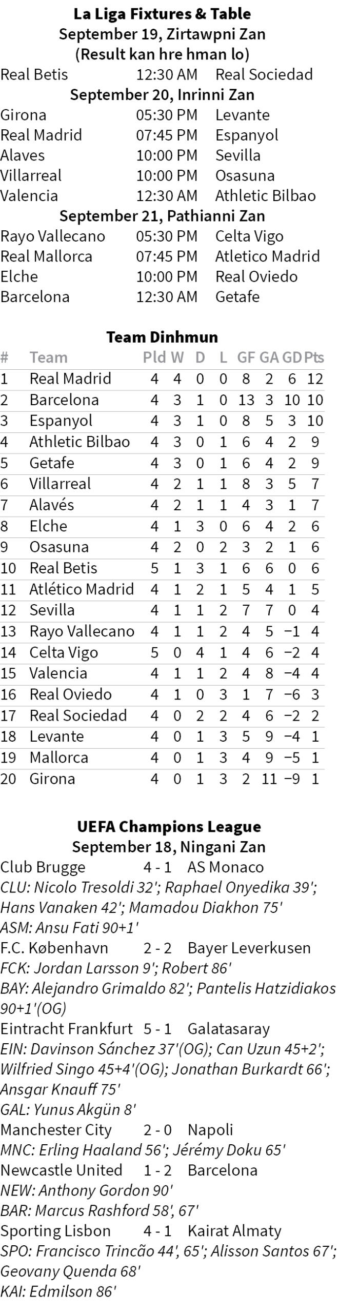 Catalan club hian Pathianni zan dar 12:30-ah league match an khel zui dawn a, Getafe an mikhual ang - tun season-a match li an khelh tawhah an la tlawm lo a, match thum chakin, match khat an draw tawh.