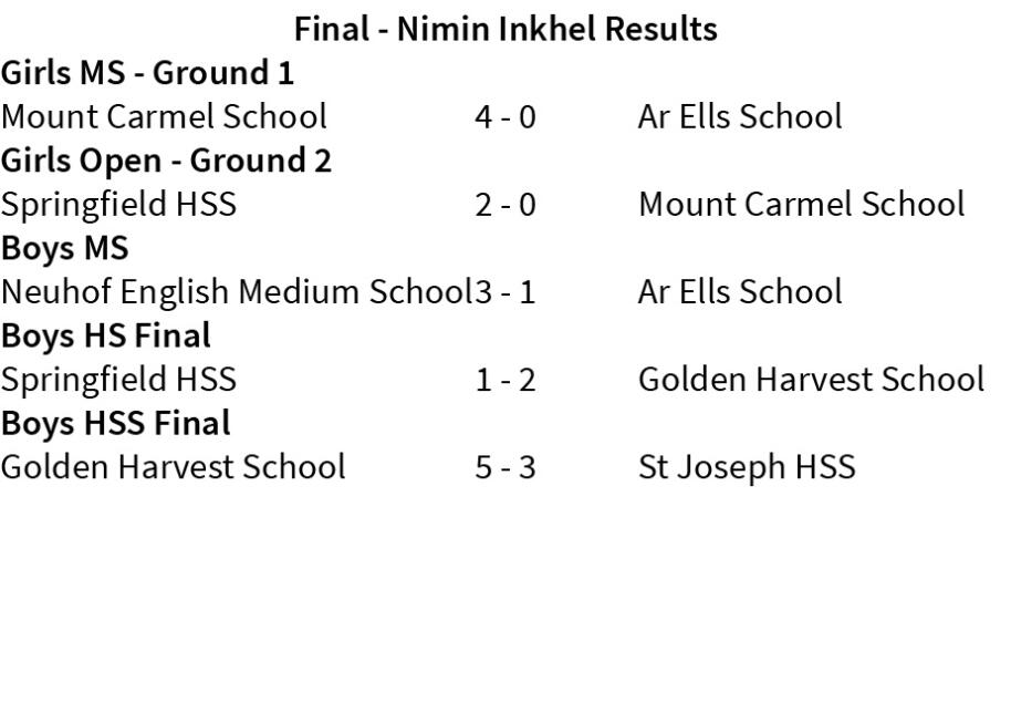 Golden Harvest School hi Tuithianga awm niin Zabanga Higher Sec School tia hriat lar ṭhin kha a ni a, final-ah hian Springfield HSS leh St Joseph HSS te an hneh. Tun hnaia infiamna lama ṭhang duang tak Neuhof English Medium School-in middle school category-ah Ar Ells School 3-1 a hnehin an champion bawk.