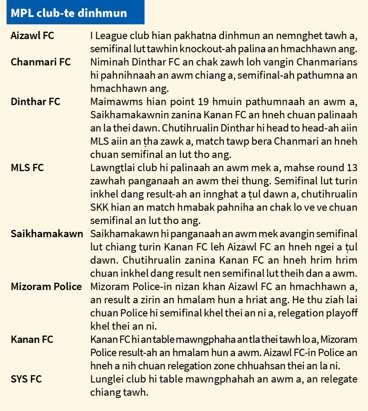 GIG Motors MPL12-ah nimin tlai khan Dinthar FC-in MLS FC laka 2-0 a an hnufual hnuah tho chhuakin 2-2 in inkhel a tawp a, semifinal lut tur hriatthiam a har lehzual. MPL Board pawhin vawiin tlai dar 3:00-a inkhel tura ruahman Kanan FC leh Saikhamakawn FC chu mipui hmuh chak zawng a ni tih hriain zanin dar 7:00-a inkhel turin an sawn.