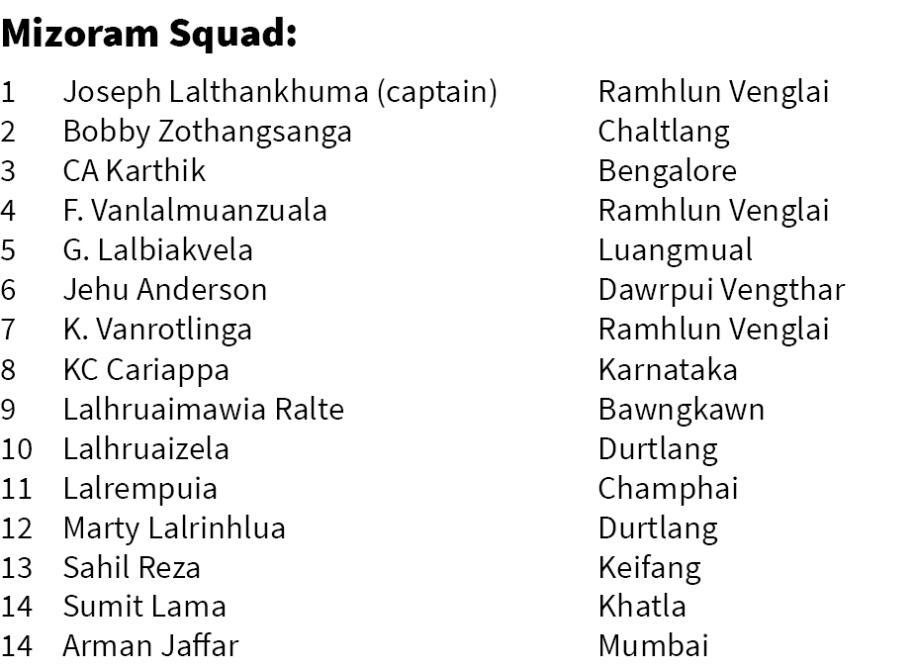 Ranji Trophy-ah Mizoram hi plate group-ah an awm, an match hmasa ber hi Ocotober 15-18 chhung khelh tur niin, chumi hnuah Arunachal Pradesh, Sikkim, Manipur leh Bihar te an la hmachhawn leh dawn a ni.