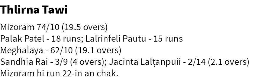 2nd Innings-ah Meghalaya lam chu over 19.1-ah out vekin run 62 an siam a, Mizoram-in run 12-in hnehna an chang a ni. Player of the Match tan Sandhia Rai, Bualpui chu thlan a ni.