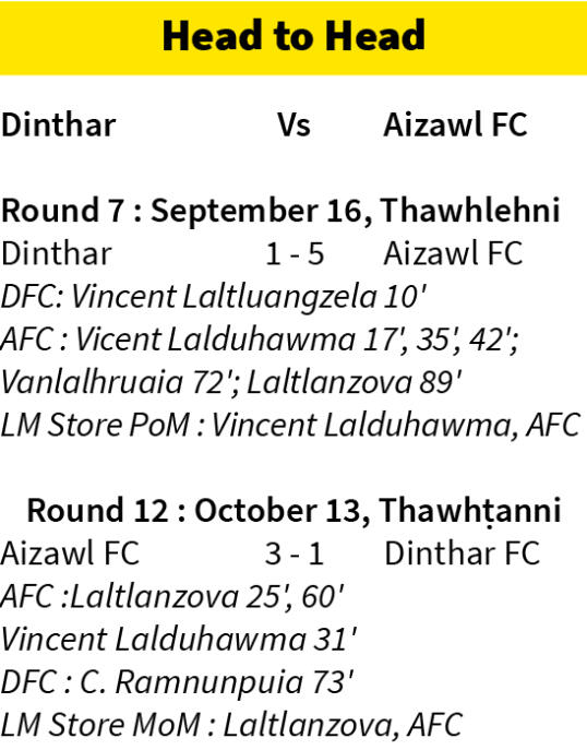 Aizawl FC-in league round-ah goal 40 an khung a, Dinthar FC nen ṭum hnih an inkhelh tawhah goal riat an khung. Thil mak tak erawh MPL12-ah goal 16 khungtu Zomuansanga'n Maimawms lakah hian goal a khung miah lo a, Khawbel tlangval tan Dinthar laka goal khung theihna remchang a rawn inhawng.