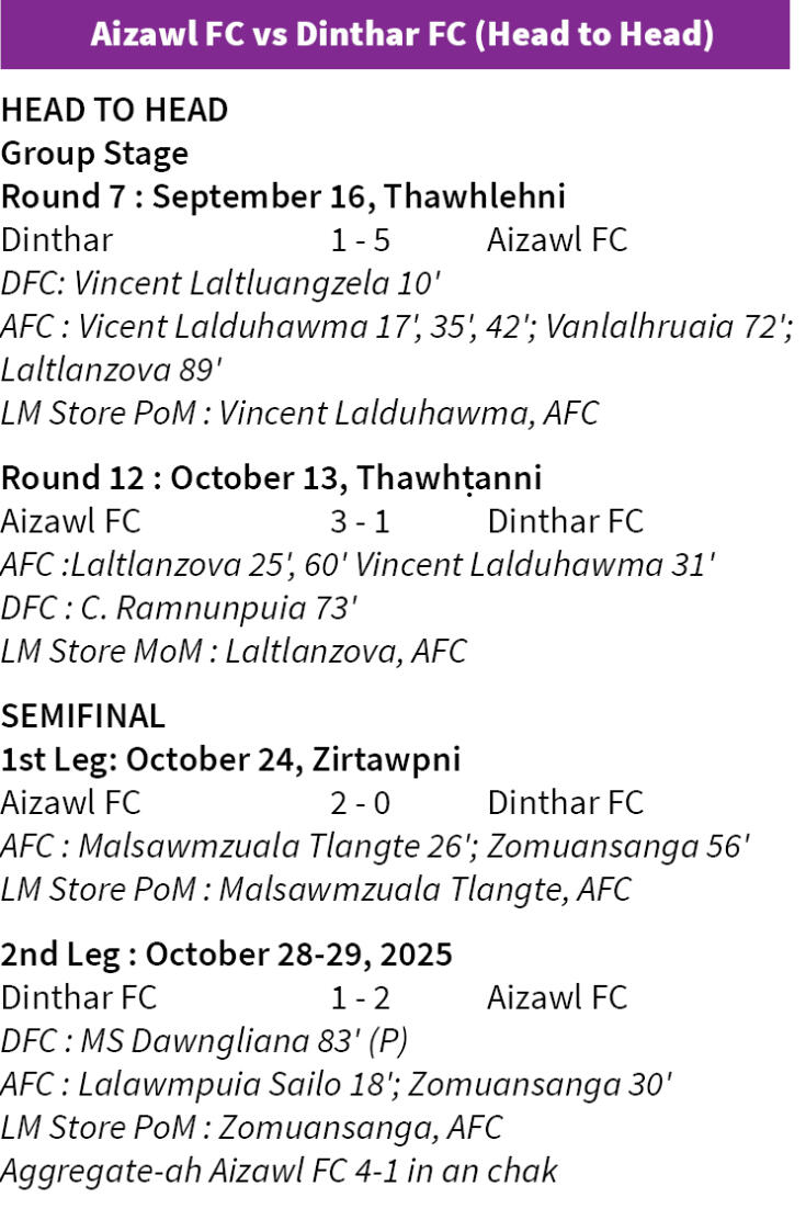 GIG Motors MPL12 semifinal hnuhnung zawkah Aizawl FC-in chak turin harsatna an tawk lo a, generator chian loh vangin final lut turin hun an mamawh rei thung. Aizawl FC leh Dinthar ten October 28, Thawhlehni zanah second leg first half-ah an khel a, I League club-in 2-0 hma an hruai. Floodlight a en theih loh avangin nimin chawhnu khan second half khelh a ni a, Dinthar FC-in goal khat chhanglet mah se second leg-ah 2-1 in I League club an chak a, aggregate-ah 4-1 in hnehna an chang.