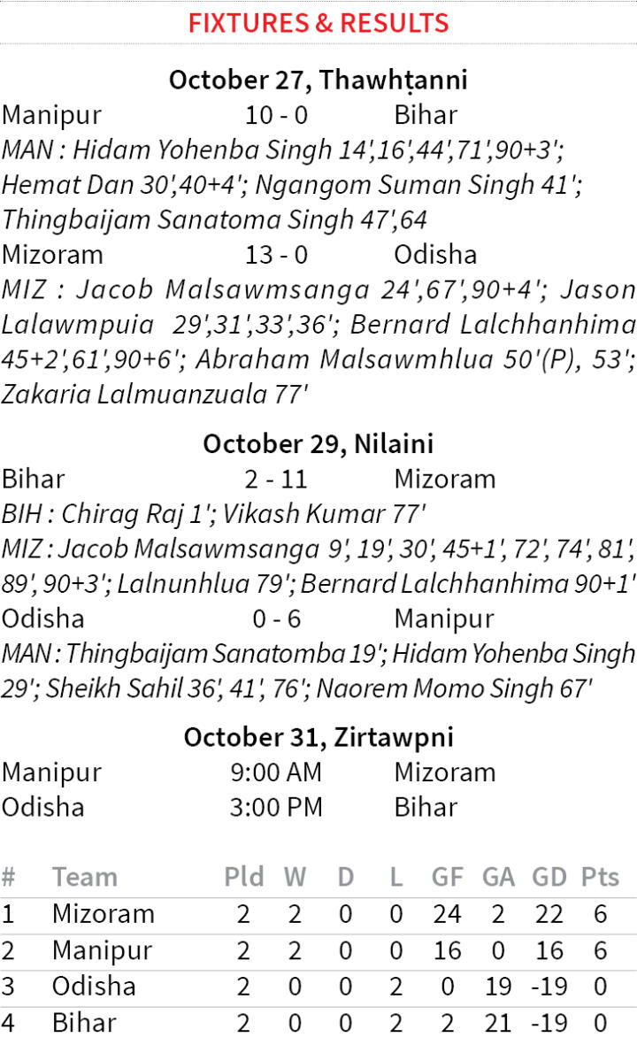 Sub Junior Boys National Football Championship-ah Mizoramin Zembawk North naupang Jacob Malsawmsanga'n triple hattrick a siam zarah an elpui Manipur aiin goal an khung tam ta zawk. Group match hnuhnung berah coach K. Lalrindika hoten Manipur hi an hmachhawn dawn a, goal an khung tam zawk avangin semifinal lut turin 'draw' a tawk ang.