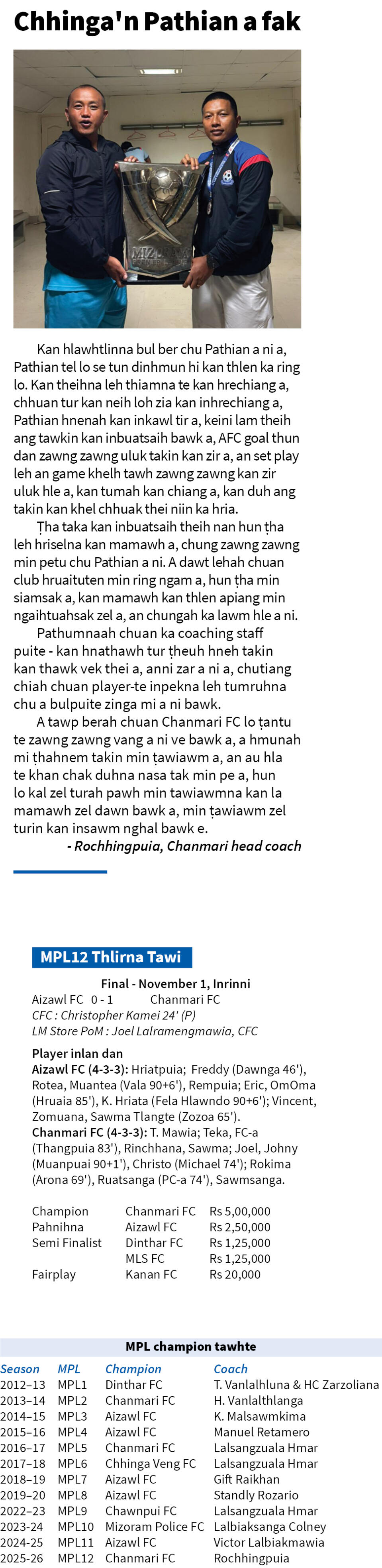 Chanmari FC chu kum kaw dawn an nghah hnuah an veng fapa rangkachak Rochhingpuia hoin GIG Motors Mizoram Premier League Season 12-ah an champion a, Mizoram chhunga football inelna sang berah a vawi thum nan an champion. Chanmarians hian final-ah record nei ṭha ber leh an hmelma Aizawl FC chu 1-0 in an hneh a, goal awmchhun hi Christopher Kamei a khung a ni.