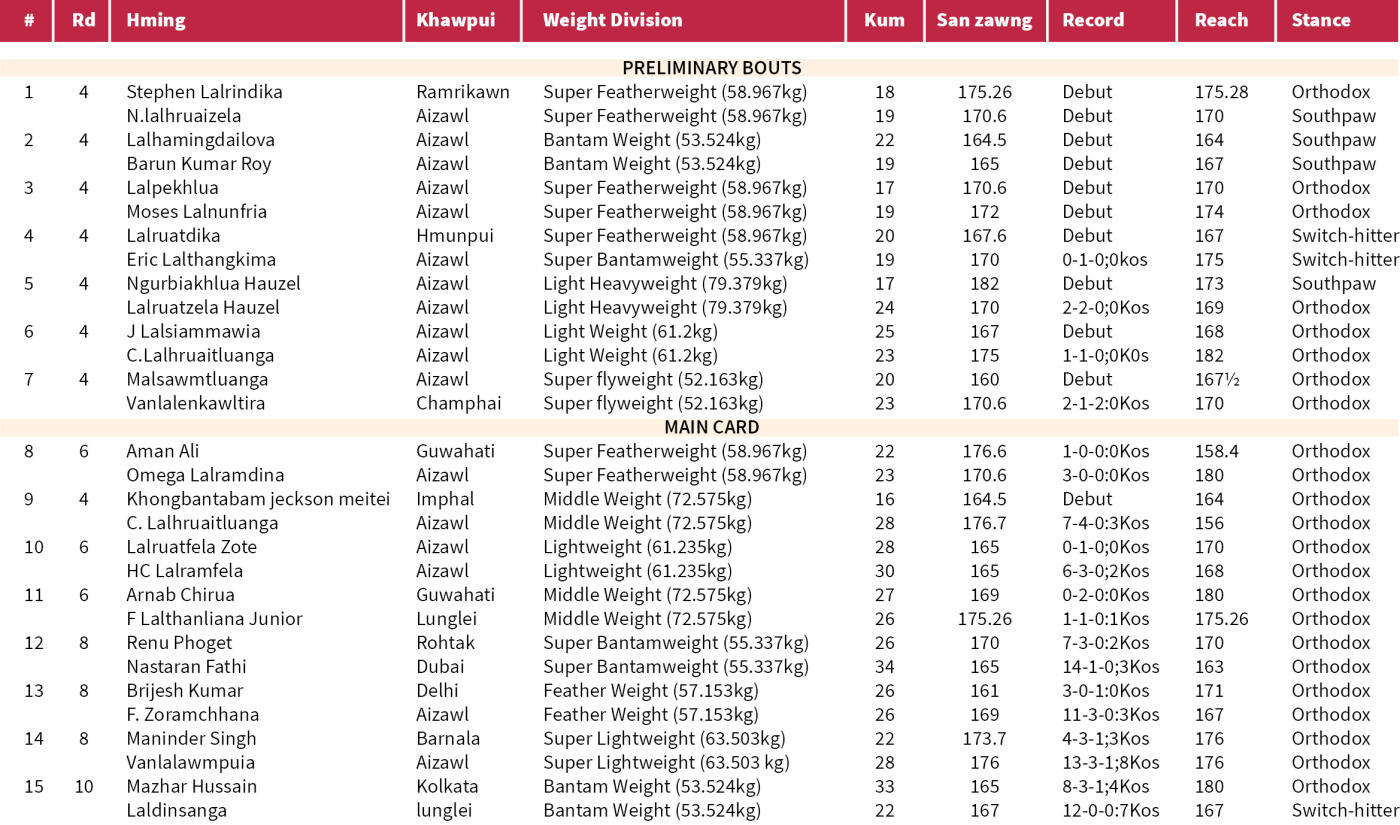 Preliminary bout hi tlai dar 4:00-ah ṭan tur a ni a, bout sarih a awm dawn. Main card-ah hian bout pariat dah a ni a, ruahman dan chuan zan dar 6:20-a ṭan tur a ni. Mizo boxer ṭha Omega Lalramdina, C. Lalhruaitluanga, Lalruatfela Zote, HC Lalramfela, F Lalthanliana Junior, F. Zoramchhana, Vanlalawmpuia leh Laldinsanga te an inlan dawn. Bout tin hi en a châkawm vek.