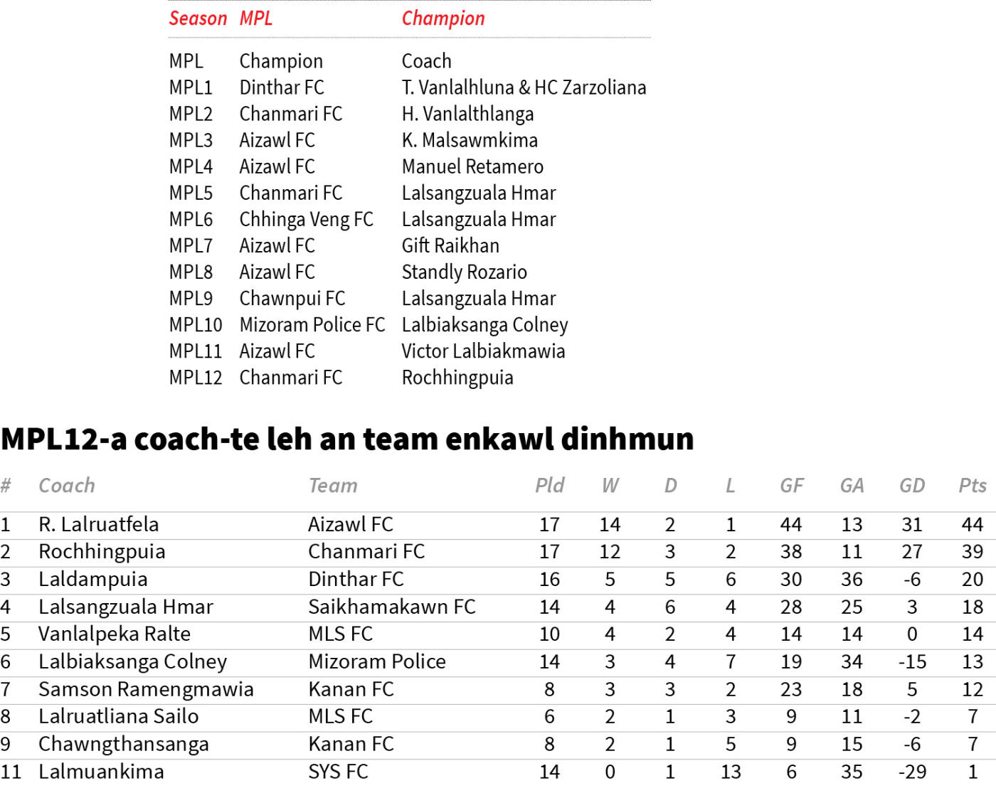 MPL12 hlutna belhchhahtu chu team enkawltu coach-te an ni a, coach-te inzir nasat zarah inelna pawh a hlawhtling. Chanmari FC fapa rangkachak Rochhingpuia'n an vengah nomawi a hawn a, hun rei tak champion tawh lo Chanmarians-in an ngaihlu hle.