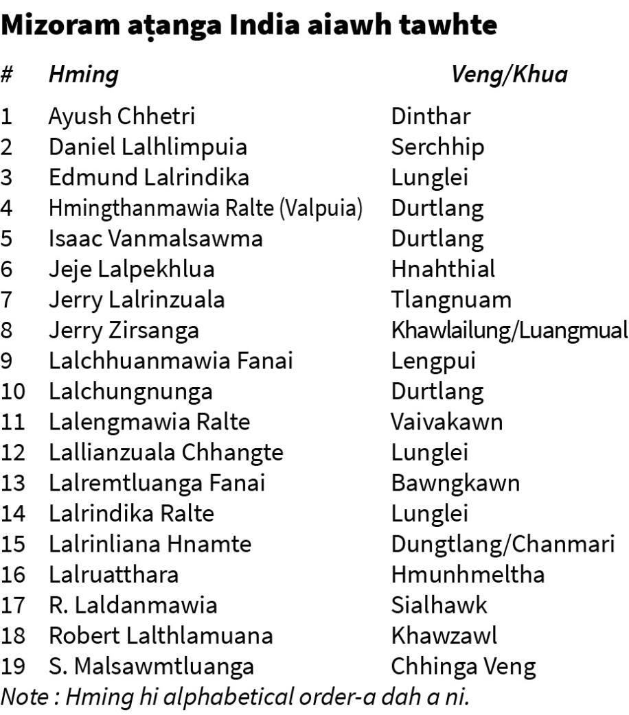 Tluangtea hma hian Mizoram player zingah ram tana inlan 18 an lo awm tawh a, Bawngkawn tlangval hi 19-na tihna a ni - India rama mipui tamzia ngaihtuahin, Mizoram sulhnu a ropui hle.