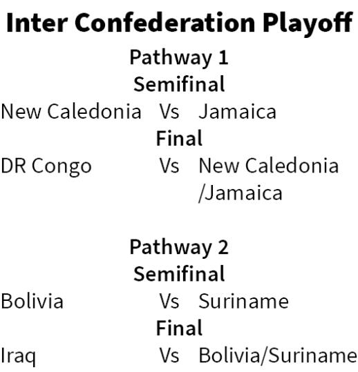 DR Congo (Africa) leh Iraq (Asia) te seeded an ni a, final lut nghalin, World Cup khel turin vawi khat chak a tawk. DR Congo hian New Caledonia (Oceania) leh Jamaica (North America) chak zawk zawk an hmachhawn dawn.