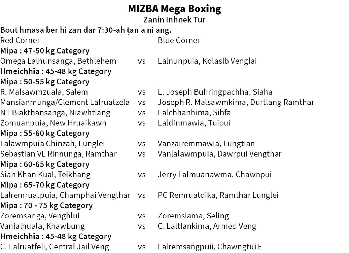 Sailo Agencies-MIZBA Mega Boxing 2025 zanin 12-naah Mizo boxer ṭha Laldinmawia a inlan dawn. Tuipui tlangval Dinmawia hi 50-55 kg category-ah a tel a, a khingpui tur chu New Hruaikawn tlangval Zomuanpuia a ni.