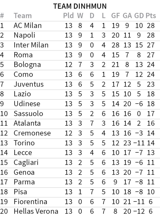 Hnehna changtu Napoli hian point 28 hmuin Serie A table-ah pahnihna dinhmun an luah, hmahruaitu AC Milan nen an point a inzat; mahse head-to-head en a nih avangin Milan an chungnung rih zawk a ni.