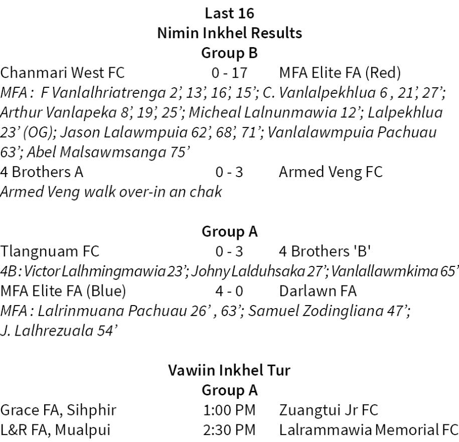 Team 14 hi group hnihah ṭhen an ni a, knockout hmanga khelh a ni. Group A-ah MFA Elite FA (Blue)-in Darlawn FA 4-0 in an hneh a, Edenthar nen quarterfinal-ah an inhmachhawn ang. 4 Brothers 'B'-in Tlangnuam FC 3-0 in an hneh a, vawiina Grace FA leh Zuangtui Jr FC inkhela chak zawk nen quarterfinal-ah an inhmachhawn ang.