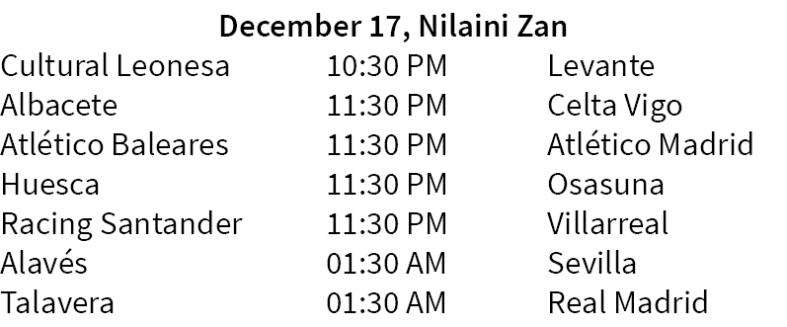Real hian zanin dar 1:30-ah Copa del Rey round of 32 khel turin Spanish fourth division club Talavera CF an lenchilh ang a, December 20 zanah Sevilla mikhualin, kuminah match dang an nei tawh lo ang.