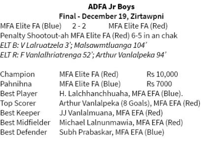 Aizawl DFA buatsaih ADFA Junior Boys Football Tournament-ah MFA Elite Football Academy (Red) chuan final-ah penalty shootout hmanga MFA Elite FA (Blue) hnehin an champion. Inelna hi kum 15 hnuai lam tan a ni a, Mizoram Football Association tan an academy team hnih final-a an inhmachhawn hi hlawhtlinna ropui tak a ni.