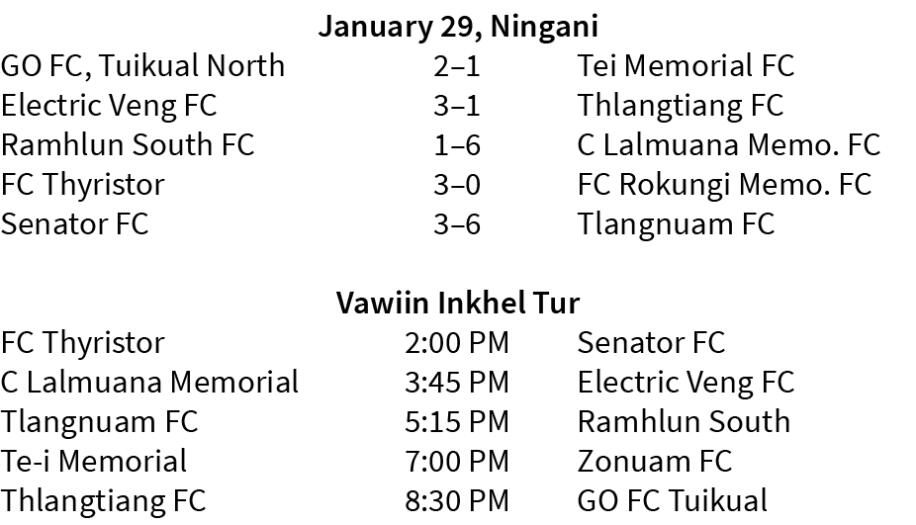 MFA Futsal League Season 7 chu January 24, Inrinni aṭang khan R. Dengṭhuama Stadium-ah khelh ṭan a ni a, vawiin hian round 4 khelh a ni dawn. Tun ṭum inelnaah hian team 11 an awm a, vawi khat ṭheuh an inkhelh kual hnuah a sang paliin semifinal an lut ang.