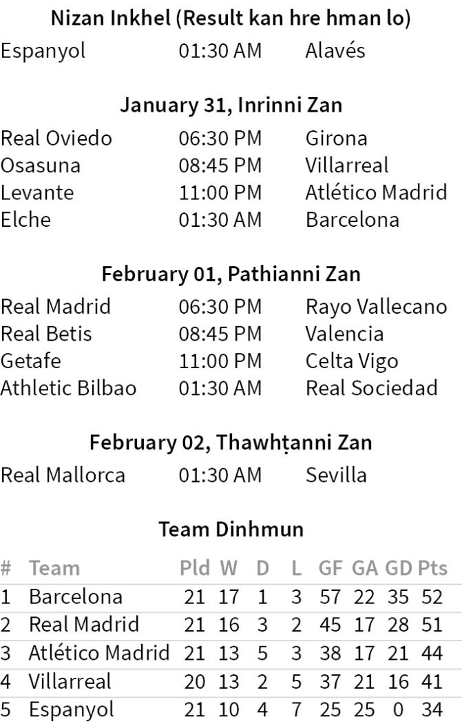 Copa del Rey round of 16-a second division club Albacete (3-2) an ngam loh leh Benfica an ngam loh hi a ni a, Pathianni zan dar 6:30-ah league match khel turin Rayo Vallecano an lenchilh zui dawn.