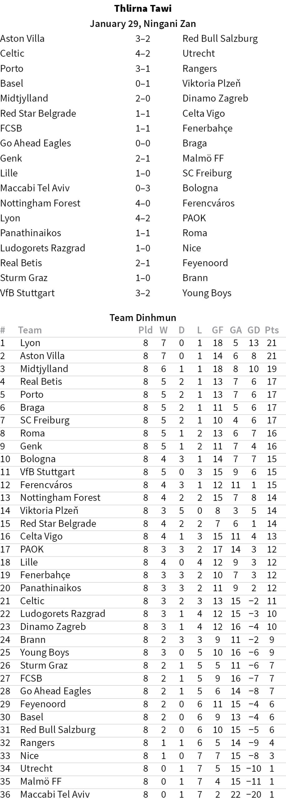 UEFA Europa League group stage chu Ningani zan khan khelh zawh a ni a, club 36-ten a ruala match khel vekin last 16 khel tur, knockout playoff khel tur leh tla turte a chiang. Premier League club zingah Aston Villa-in pahnihna dinhmun luahin last 16 an lut a, Nottingham Forest-in Ferencvaros 4-0 a hnehin 13-naah awm a, playoff an khel dawn.