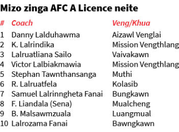 Mizo coach pathum F. Liandala (Sena) (North Mualcheng), B. Malsawmzuala (Luangmual), Lalrozama Fanai (Bawngkawn) te chuan Asian Football Confederation 'A' Licence coach an pass thar. Mizo zingah AFC A licence coach 10 an awm chiah.