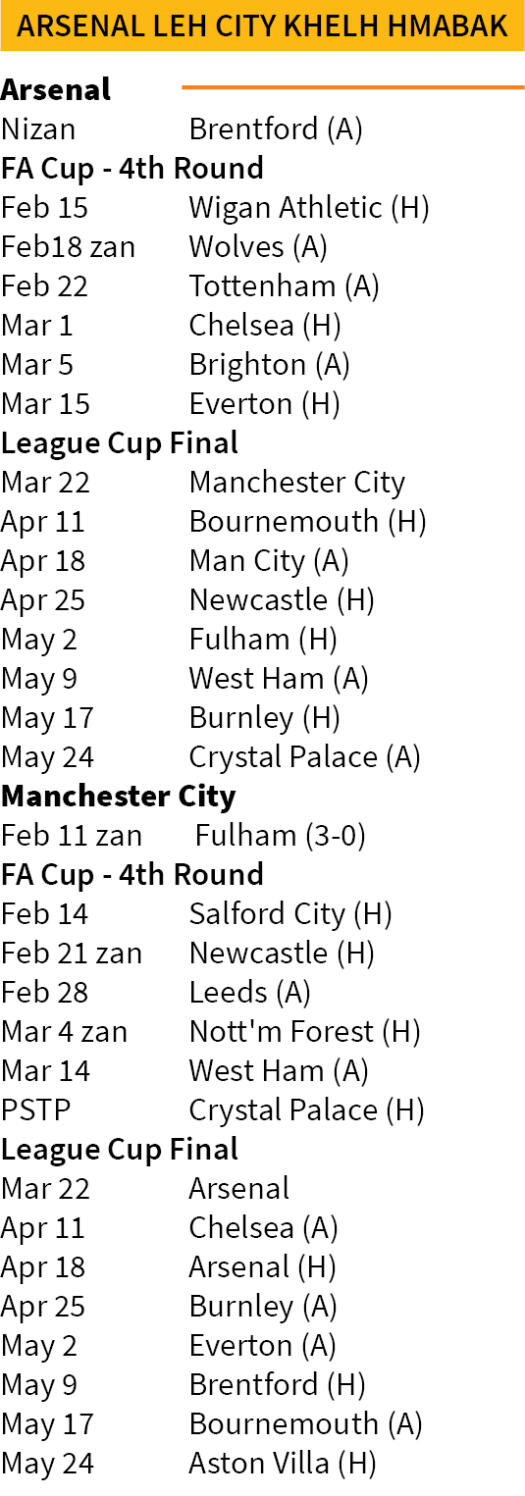 Nilaini zan khan Manchester City-in Etihad Stadium-ah Fulham 3-0 in an sawp a, Premier League champion inum boruak nung sawt. Pep Guardiola hote hian match 26 aṭangin point 53 an hmu a, an chunga awm Arsenal point thum chauhin an pha tawh lo. Nizan khan Mikel Arteta hoten Brentford an hmachhawn a, inkhel result kan hre hman lo thung.