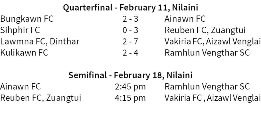 MFA Futsal Division One Season Opening Tournament quarterfinal-ah Ainawn FC, Ramhlun Vengthar SC, Reuben FC (Zuangtui) leh Vakiria FC (Aizawl Venglai) ten an khingpui ṭheuh hnehin semifinal an lut. Final khel tur zawnna hi February 18, Nilaini hian R. Dengṭhuama Stadium, Mualpuiah neih a ni ang.