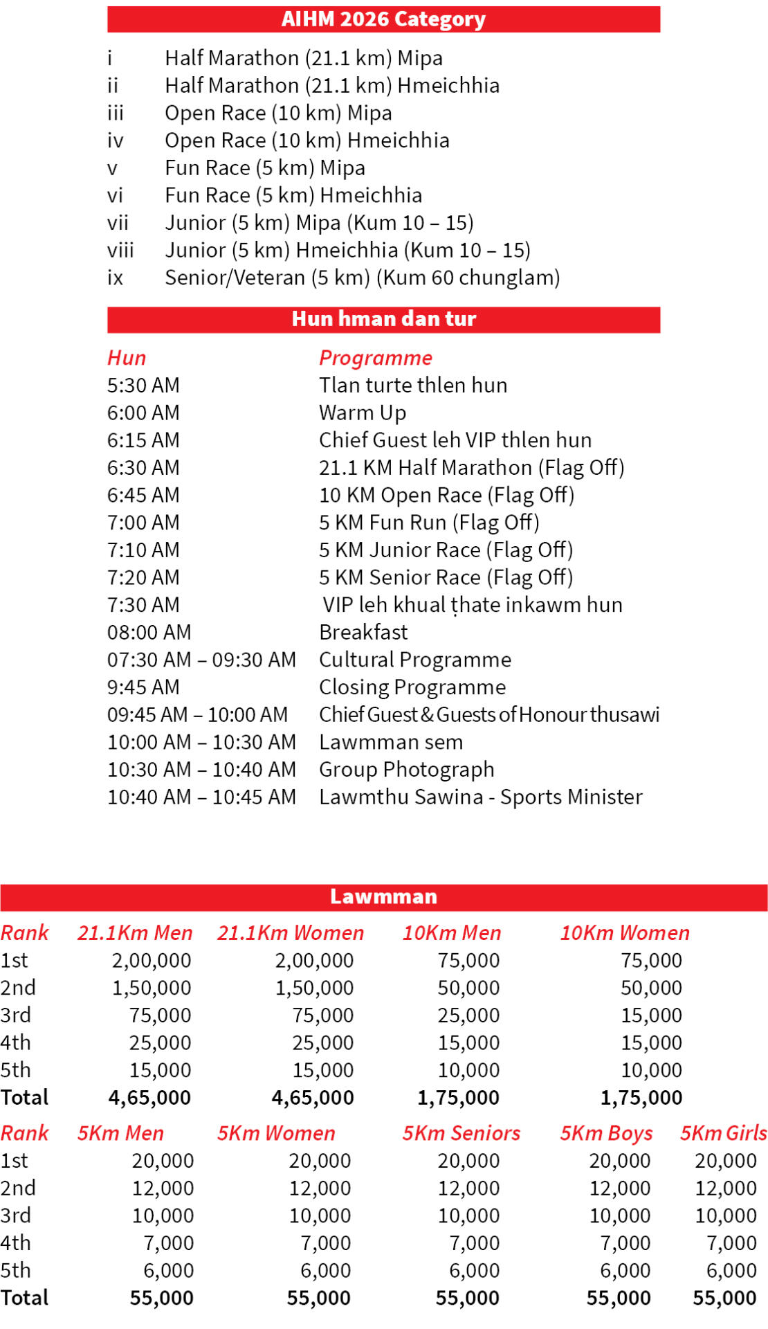Aizawl International Half Marathon (AIHM) 2026 chu Valentine's Day-ah (February 14) neih a ni leh dawn. Vawiin thleng Lammualah a la inziah luh theih a, infiamna leh hriselna lam ngaina tan 'international event' a tel theihna hun ṭha hi bawhpelh phal chi a ni lo. Europe leh Africa aṭangin infiammi an rawn tel dawn.