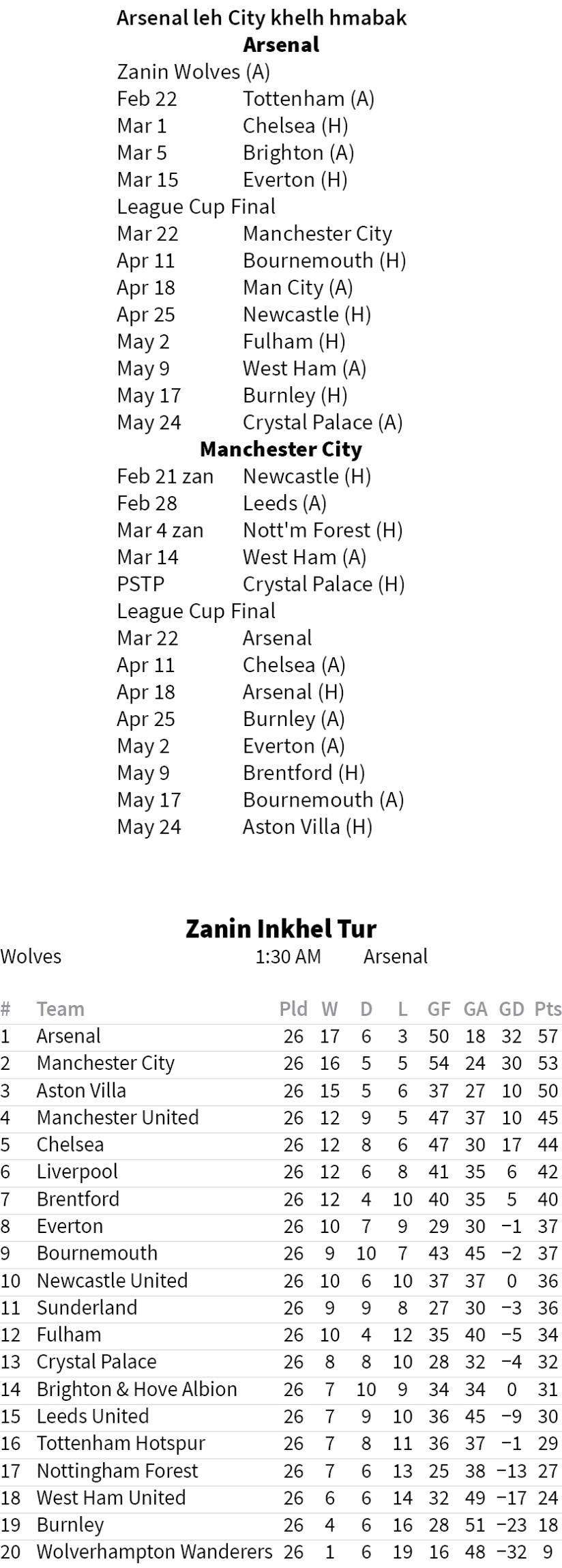 Premier League-ah Arsenal-in zanin dar 1:30 hian Wolverhampton Wanderers an hmachhawn dawn a, champion tum Mikel Arteta hote tan pakhatna dinhmun sawhnghehna hun remchang a ni ang. Gunners hian match 26 aṭangin point 57 an hmu a, anmahni hnaih bertu Manchester City aiin point liin an hmu tam zawk.