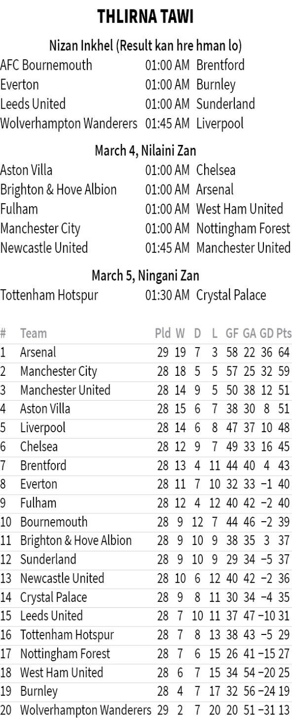 Premier League nomawi inchuh boruak a 'hot' chho a, pressure sangah Arsenal-in London club ṭha pahnih Tottenham Hotspur leh Chelsea an hneh avangin inrintawkna an nei let leh ta. Zanin dar 1:00 hian Gunners-in Brighton an tlawh ang a, an elpui Manchester City-in Nottingham Forest an mikhual thung ang.