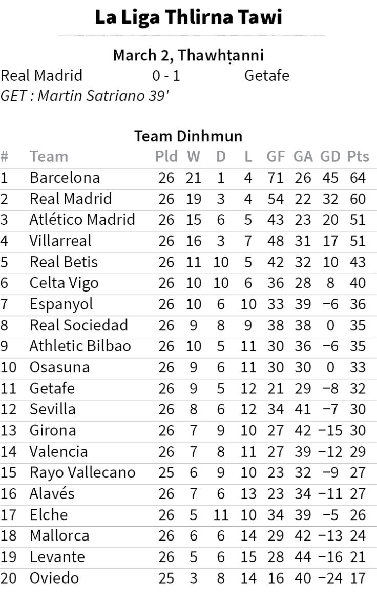 Thawhṭanni zan khan Real Madrid an chak lo leh a, Real hian an chak loh chuan an hmelma Barcelona nen an inkar a zau sawt dawn tih hre chungin an khel a, mahse an mualah 1-0 in Getafe an hneh lo. Getafe tan Martin Satriano-a'n goal awmchhun a khung a, Real-in chhanletna tur an nei lo.