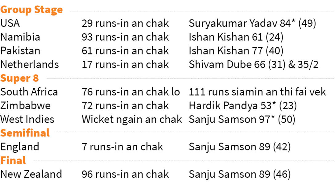 lndia-in group stage-ah an khingpui an hneh vek a, group match-ah hian an bat hmasa vek. Super 8-ah South Africa an hneh lo a, Men in Blue-ah tun ṭum inelnaah Proteas chauh an hneh lo. Semifinal thleng lo thei dinhmuna an din hnuah Zimbabwe an sawp a, West Indies an hneh hram. Final khel tur zawnnaah England an hneh a, nomawi chawi turin New Zealand an sawp.