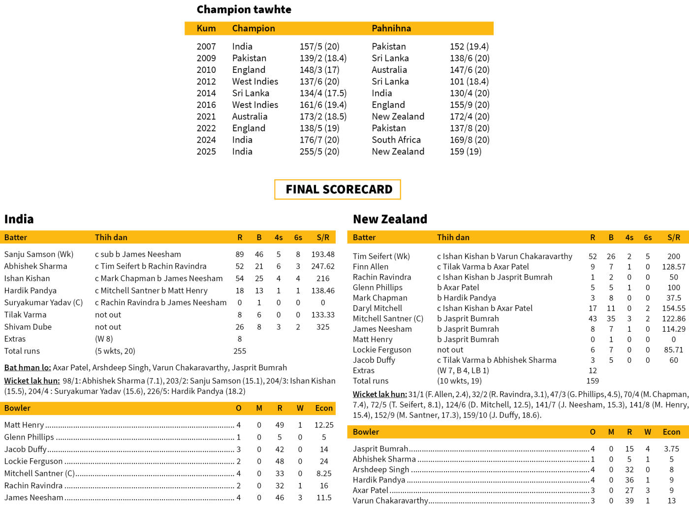 T20 Cricket World Cup hi kum 2007 aṭangin khelh ṭan a ni a, MS Dhoni captain-na hnuaiah India an champion hmasa ber. Kumin inelna neih hma hian India bakah England leh West Indies te vawi hnih ṭheuh an champion tawh a, mahse champion zawn an la awm lo.