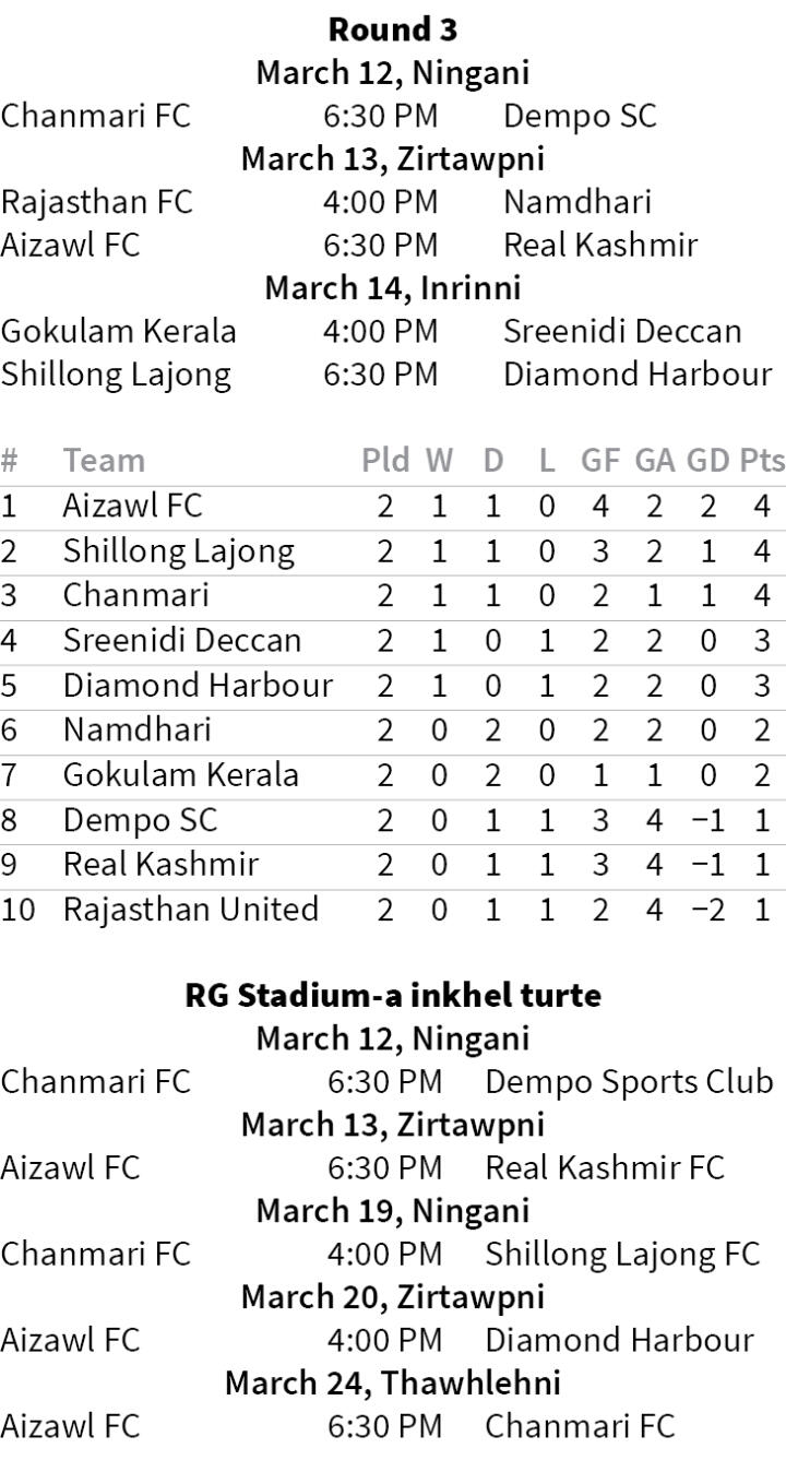 Indian Football League-ah NorthEast club pathum Aizawl FC, Shillong Lajong leh Chanmari FC ten point li vek an hmu a, a sang pathumah an awm. MPL champion Chanmari tan pakhatna dinhmun luah theihna hun ṭha a inhawng a, zanin dar 6:30 hian RG Stadium-ah Goan club hlun Dempo SC an mikhual dawn.