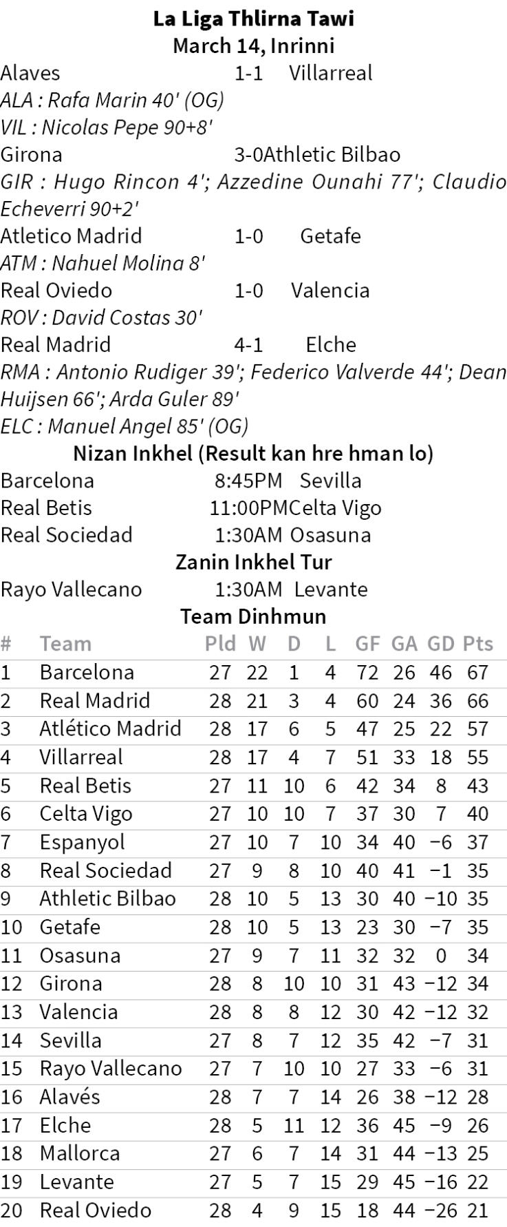 Spanish club lian Real Madrid chuan Inrinni zan khan 4-1 in Elche an hneh a, an hmelma Barcelona an hnaih sawt. Real tan Antonio Rudiger, Federico Valverde, Dean Huijsen leh Arda Guler ten goal khat ṭheuh an khung a, Real midfielder Manuel Angel-a'n an lamah tilut mah se Real tan buaina tham a ni lo.