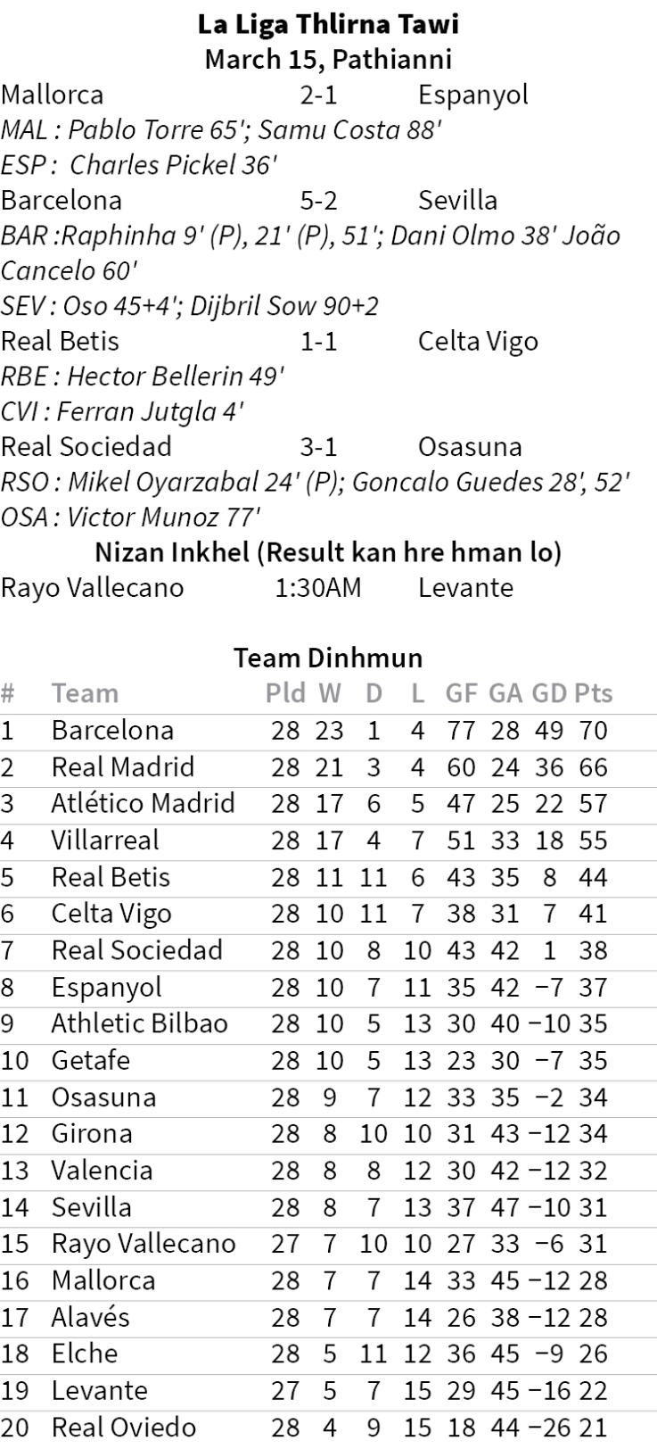 La Liga hmahruaitu Barcelona chuan Pathianni zan khan 5-2 in Sevilla an hneh a, hma an hruai chhunzawm zel. Barca tan Raphinha-a'n hattrick a siam a, Dani Olmo leh Joao Cancelo ten goal khat ve ve an khung bawk. Sevilla tan Oso leh Djibril Sow te goal khung chu scoreline timawitu chauh a ni.
