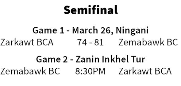 Mizoram Super League semifinal-ah game hmasa zawkah Zarkawt BCA an chesual a, champion lai hi Zemabawk BC lakah an chak lo. Zanin dar 8:30 hian semifinal game 2 khelh a ni dawn a, inkhawm bana en nuam tawk a ni. MSL champion lai hi an chesual nawn leh a nih chuan an tla dawn.