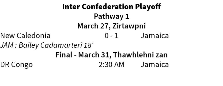 Inter Confederation Playoff final lut turin Jamaica-in New Caledonia an hneh a, zanin dar 2:30 hian Zapopan, Mexico-ah DR Congo nen final an khel ang. Heta chak zawk hian World Cup an khel dawn.