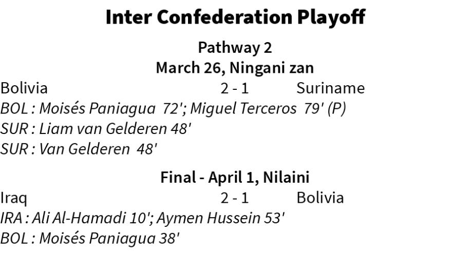 Guadalupe-a inkhelah Iraq-in Ali Al-Hamadi hmangin minute 10-na lekah an khung a, Bolivia-in minute 38-naah Moisés Paniagua hmangin an sut. Second half-ah Iraq-in bul an ṭan leh a, Marko Farji cross chu Aymen Hussein-a'n minute 53-naah a khung.