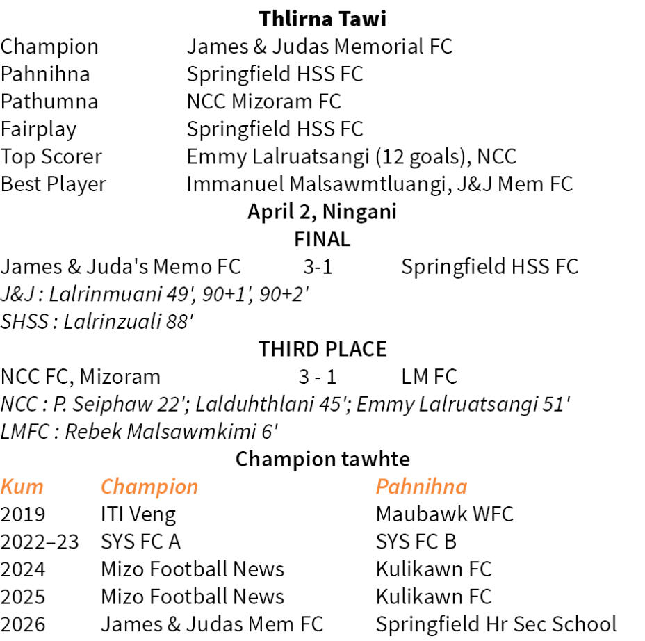 MBOCWWB Women's League 2025-26-ah James & Juda's Memorial FC chuan April 2, Ningani khan final-ah Springfield HSS FC 3-1 a hnehin an champion a, Chite Veng Playground-a inkhelah hian Mizo hmeichhe striker hriam Lalrinmuani'n hattrick a siam. Champion-na kawnga player pawimawh Immanuel Malsawmtluangi chu best player-ah thlan a ni.