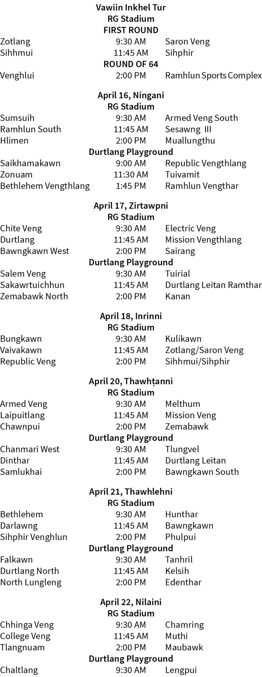 Chawhma dar 9:30-ah Zotlang leh Saron Veng an inkhel ang a, chhun dar 11:45-ah Sihhmui leh Sihphir an inkhel chhunzawm ang. Chawhnu dar 2:00 aṭangin round of 64 khelh ṭan a ni nghal dawn a, Venghlui leh Ramhlun Sports Complex te an inkhel ang.