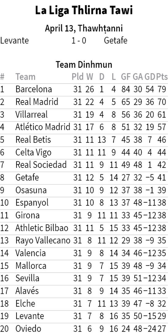 Hetihlai hian Levante erawh point 29 hmuin 19-naah an chho a, table mawngphah an chhuahsan. La Liga match sarih chiah khelh tur a awm tawh a, inhamtan an tum a nih chuan tha thlah loa an ṭan a ngai tawh.