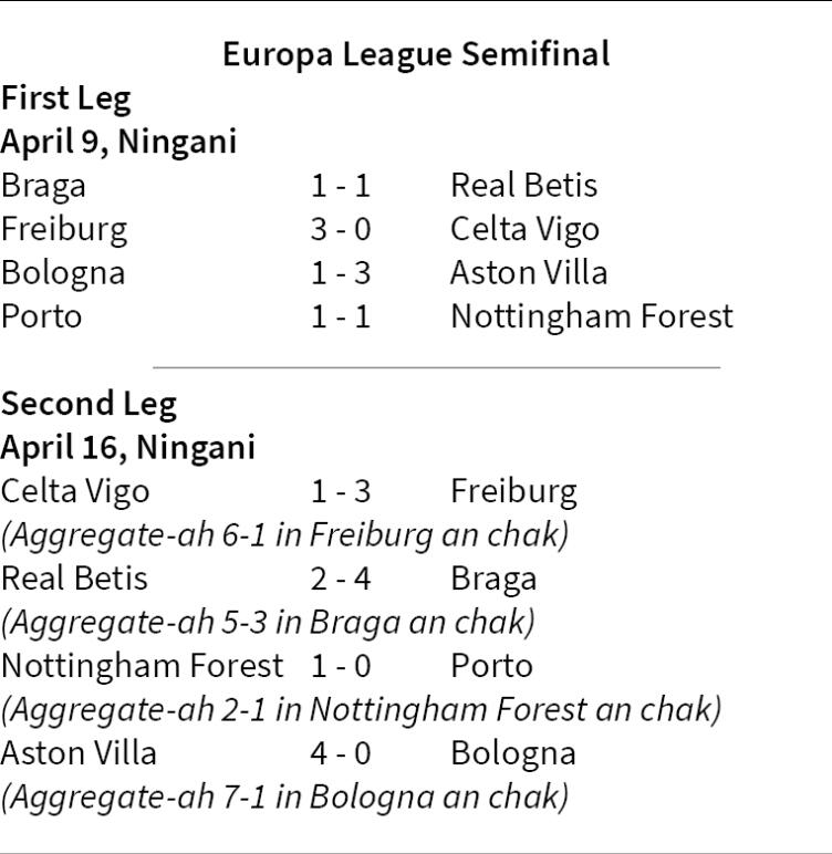 Premier League club Aston Villa chuan, Ningani zan khan Europa League quarterfinal-ah 4-0 in Bologna an sawp a, aggregate-ah 7-1 in an chak. Villa-in semifinal lut turin goal khung kawngah harsatna an tawk lo.