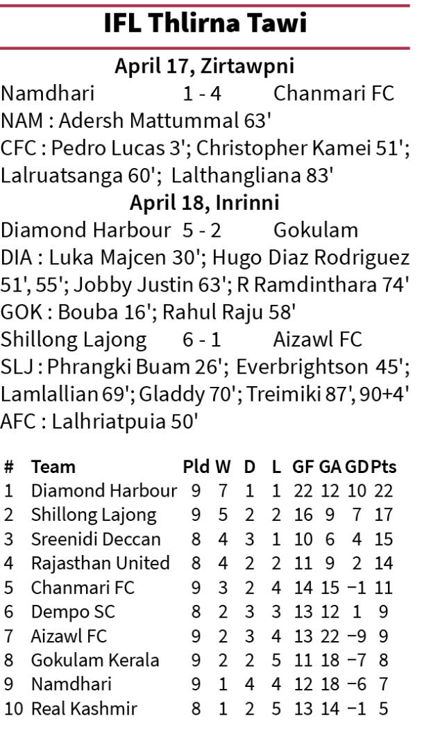 Indian Football League-ah Aizawl FC-in league round an khar ṭha lo a, Inrinni zan khan Shillong Lajong-in 6-1 in an sawp. Mizo club tan mangchhia a ni a, Lajong laka point an hlawhchhuah zawh loh avangin championship stage khel pha turin an tling zo lo a, relegation stage an khelh a ngai dawn.